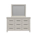 The Canterbury Dresser and Mirror Set exudes timeless elegance with its sleek smooth finish on rich cherry veneer, blending modern and classic design. The ball bearing drawer glides ensure smooth, quiet operation, while refined brushed nickel handles add sophistication. Stylish inset panel fronts and sophisticated beveled edges enhance visual appeal, making this set a stunning focal point in any bedroom. The graceful, beveled mirror completes the ensemble, adding charm and functionality. The Canterbury Dresser and Mirror Set perfectly combines functionality and elegance, bringing style and luxury to your living space. Features: • Sleek Grey Finish on Cherry Veneer for Timeless Elegance • Ball Bearing Drawer Glides for Effortless, Quiet Drawer Operation • Graceful Beveled Mirror • Refined Brushed Nickel Handles for a Touch of Refinement • Stylish Inset Panel Fronts for Visual Appeal • Sophisticated Beveled Edges for Added Charm • 60"W x 17"D x 74"H • Due to lighting, product color may slightly vary from images. Dimensions: Depth: 17.0" x Width: 64.0" x Height: 74.0" Weight: 220.0 lbs.