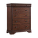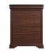 The Phillipe 5-Drawer Chest is the epitome of elegance and sophistication. With its sleek stained drawer panels, this piece will add a touch of luxury to any bedroom. The beveled edges throughout enhance its refined look, while also offering practical features like a top jewelry drawer with black felt lining to provide a safe and stylish storage solution. Crafted from fine poplar wood with a beautiful cherry finish, the Phillipe Chest is a timeless piece built to last. Features: • Poplar Wood with Cherry Finish • Stained Drawer Panels • Top Jewelry Drawer with Black Felt • Dark Brass Knobs • Beveled Edges • Anti-tipping Kit Included • 40"�W x 19"�D x 50"�H Dimensions: Depth: 19.0" x Width: 40.0" x Height: 50.0" Weight: 189.0 lbs.