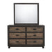 The Harlington 6-Drawer Dresser will add more than just function to your bedroom! This bedroom dresser comes with six, large spacious drawers; perfect for keeping all of your belongings neatly stored away. The top drawers are felt lined, which means you can store your more delicate belongings without worry. The bottom drawers features a dust proofing layer to help protect your belongings. The unique finish on this dresser is very striking with the framing in a dark chocolate color, while the drawer fronts are a complementary lighter finish. The portrait orientation mirror features the same dark chocolate finish. Completing the look are the dark nickel drawer pulls and square feet. - Six Spacious Drawers - Felt-Lined Top Drawer - Dust Proofing on Bottom Drawer - Dark Nickel Drawer Pulls - Transitional Style - Square Feet - Dark Chocolate Finish Framing the Drawers - Portrait Orientation Mirror - Anti-Tipping MDF/Particle Board 18 D x 61 W x 78 H, 165lbs. 1 Year Limited Manufacturer Warranty