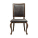 The Gramercy Side Chair Set will look great in your dining room! These chairs feature a faux leather upholstered seat and back in a rich, chocolate color. The faux leather is distressed, instantly adding character and charm to this chair duo. The front legs are curved, adding extra flair to these already stylish chairs. The foam cushion seat and back will keep you plenty comfy during even the longest of dinners. Detailed piping along the cushions add the perfect finishing touches to this set; while the natural wood grains and warm walnut finish complete the look. - Includes: Two Side Chairs - Chocolate, Faux Leather Upholstered Seat and Back - Distressed Faux Leather - Curved Front Legs - Wood Framing around Fabric - Foam Cushion Seat and Back - Detailed Piping along Cushions - Natural Wood Grains - Warm, Walnut Finish Acacia Oak Veneer MDF Foam Plywood Rubberwood 23 D x 27 W x 39 H, 39lbs. 1 Year Limited Manufacturer Warranty