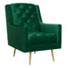 The Bryan Button Tufted Chair with Gold Legs is the epitome of modern glam design! This chair features a super luxurious velvet-like fabric, that feels good to the touch. Button tufting on the back and seat bring the glam, while the gold metal tapered legs bring the modern design. Straight edge arms and a foam cushion seat and back provide comfort while you sit back and relax in this chair. The chair is so nice, youll want to buy it twice. - Modern Glam Design - Button Tufted Seat and Back - Gold Metal Legs - Velvet-Like Fabric - Straight Edge Arms - Foam Cushion Seat & Back - Diamond Stitching Pine/Plywood Frame S-Spring Seat Construction Webbing Back Construction Foam Arm/Seat/Back Cushion Filling Arm Height: 25"; Arm Width: 3.5" Seat Height: 18"; Seat Depth: 21"; Inside Seat Width: 22" Back Height: 20" Feet Height: 9" Attached Cushions 34 D x 29 W x 38 H, 35lbs. 1 Year Limited Manufacturer Warranty