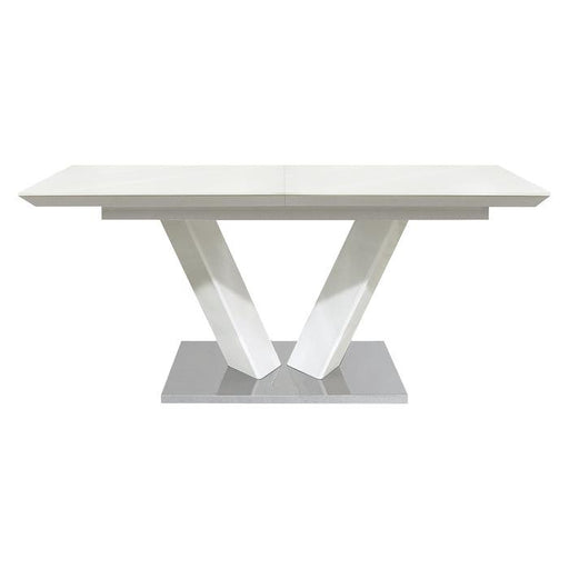 Yannis Collection by Homelegance Ultra-bright high gloss finish Manmade wood table top V-shaped support with chrome base plate Self storing butter...