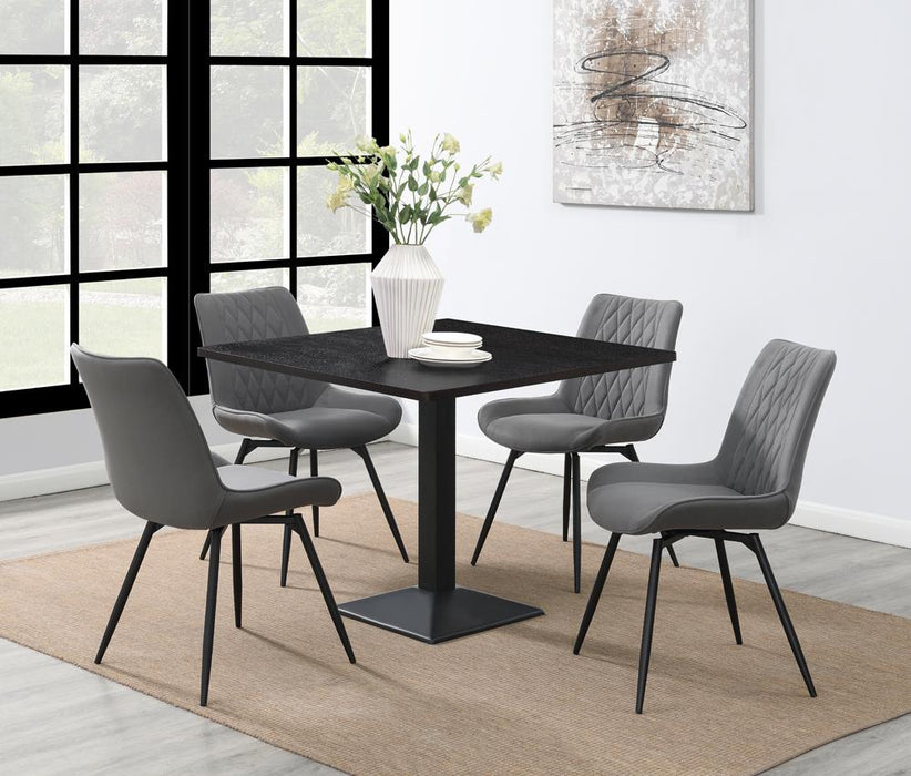 Sleek and stylish, this minimally designed modern dining table is perfect for compact spaces. Capable of seating up to four guests or family members, this square dining table features a supportive pedestal-style frame with a square-shaped flush base, offering an open space beneath for sliding in chairs. Dark tones throughout, the pedestal base features a metal construction and a smooth gunmetal finish, while the wood tabletop surface displays an espresso oak veneer. Allow this dining table to double as a game table in a media room or entertainment area. With a dark color palette and sleek lines, it is sure to add a contemporary flair to any home.