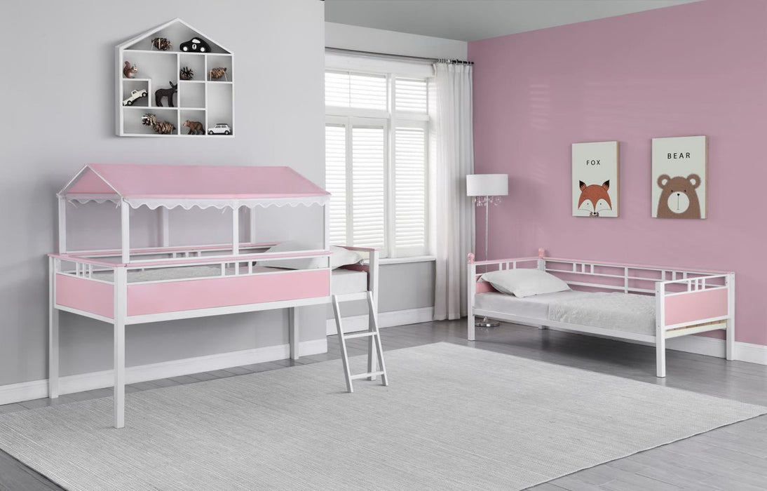 Your little one will work hard and sleep soundly with this twin over twin workstation loft bed. Made from steel and composite wood planks, this workstation loft is finished in a sweet combination of pink and white. The bottom bunk features a twin bed with a shelf to serve as a workstation, leaving room for items such as books and a laptop. The top bunk has a unique tent design that little ones will love. Watch this pink and white workstation loft become the main attraction in your little one's bedroom.