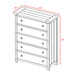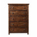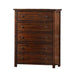 The Dawson Creek 5-Drawer Chest is the perfect addition to your bedroom! This vertical chest comes with five, spacious drawers; perfect for keeping all of your belongings neatly stored away. The bottom drawer features a dust proofing layer to help protect your belongings. Brass finished metal drawer knobs, pair beautifully with the deep chestnut finish. This rustic design will easily become a staple in your bedroom year after year. - Deep chestnut lacquer - Custom select solid hardwoods and veneers - Corner block reinforcements with wood cleats and screws - provides solid construction - Brass finished metal knobs - Dust proofing on the bottom shelf for added protection - Full extension side glide drawers - Solid hard wood; MDF; Plywood; Acacia Veneers 18 D x 41 W x 53 H, 128lbs. 1 Year Limited Manufacturer Warranty