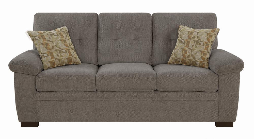 Classic comfort abounds with this casual oatmeal sofa from the Fairbairn Collection! Upholstered in a soft plush fabric with additional padding on the armrests and back cushions, this three-cushion sofa will be a delight to relax upon after work, during movie nights, or when entertaining guests. Enjoy the subtle design element in each back cushion's two button tufts.