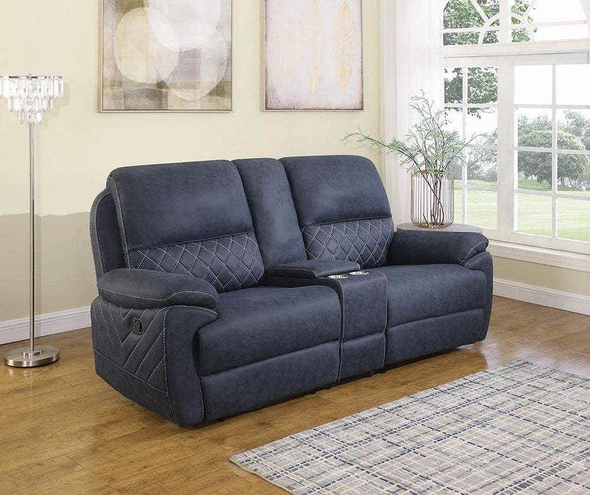 - Motion loveseat upholstered in blue performance faux suede- Wall hugger mechanism- Console features soft-closing lift top storage and two (2) cup holders with removable stainless steel inserts- Pocket coil seating- 1" 3.0lbs cool gel memory foam topper- Certi-Pur certified foam