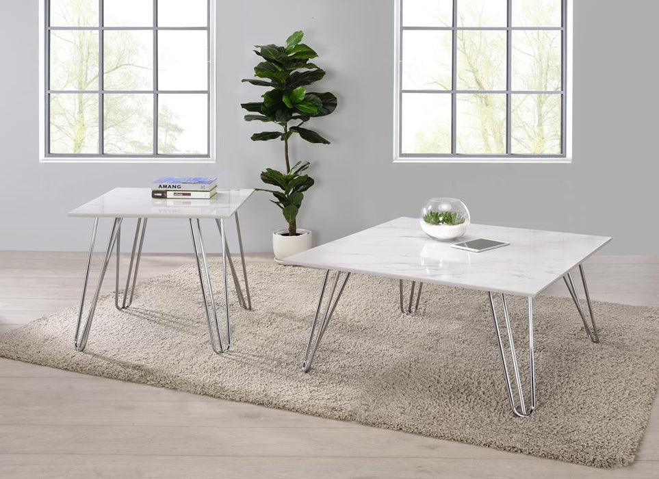 Style your décor with a modern glam touchBeautiful faux white marble square topsModern hairpin styled legs finished in electroplated chromeConstructed with metal, MDF