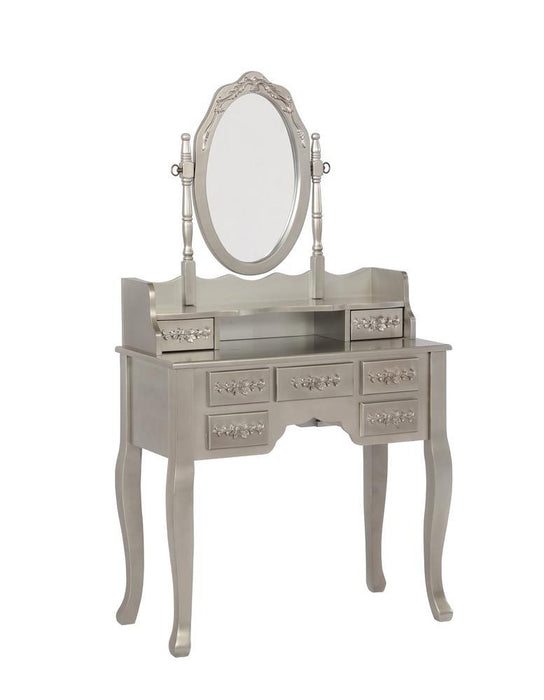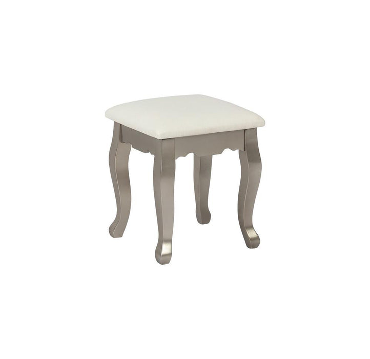 With its gleaming silver finish, refined embellishments, and elegantly curved legs, the Contemporary Metallic Silver Vanity Set blends traditional and modern styles for a glamorous look.
